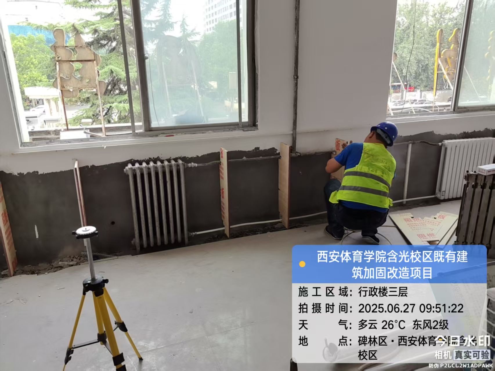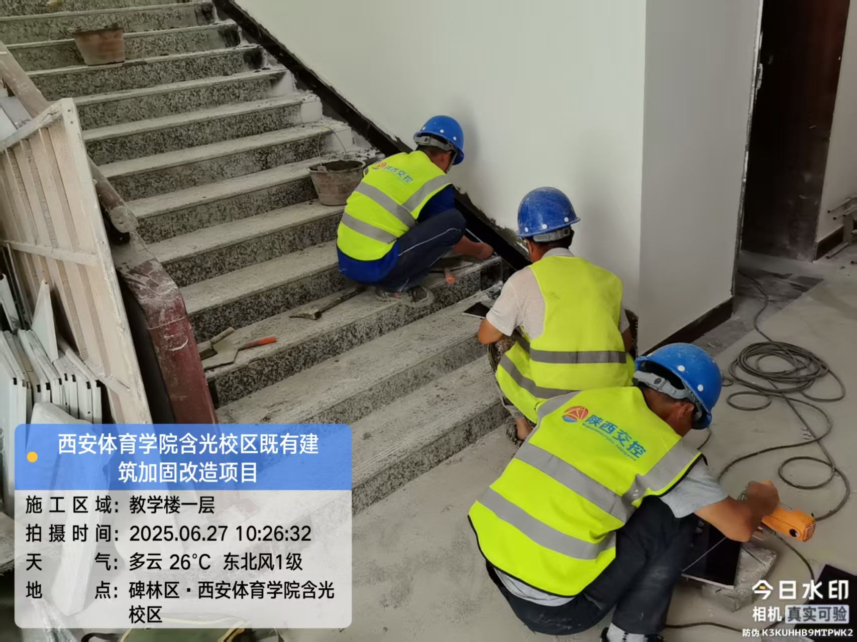截止6月27日,含光校区既有建筑加固改造项目多个区域同步开展施工,行政楼、教学楼等施工现场繁忙有序。