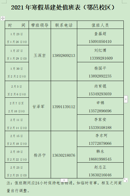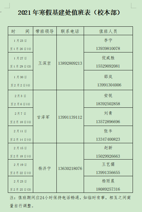 本周六、周日(1月6、7日)继续上班,同时请各位老师按照寒假值班表安排,认真做好校本部和鄠邑校区值班值守工作,严格履行疫情防控职责。值班安排如下:
