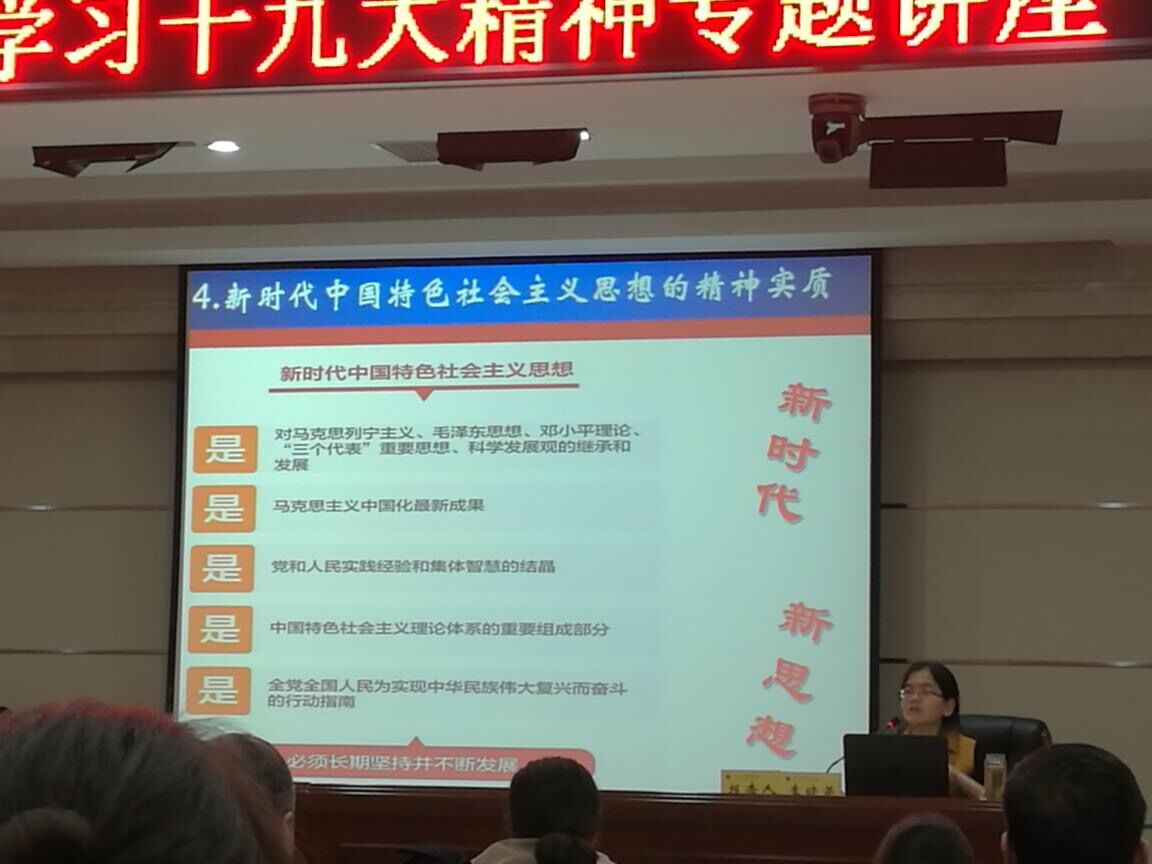本次讲座由李晓燕主讲,其以“新时代、新思想、新部署、新要求”作为主题,以学习贯彻党的十九大精神,谱写追赶超越发展新篇章作为主要内容,为学院领导班子成员,全院副处级以上干部、各民主党派、无党派人士代表等进行了专题讲座。