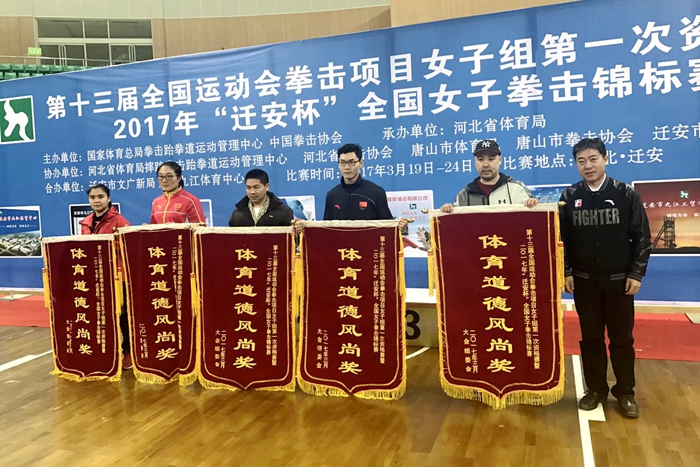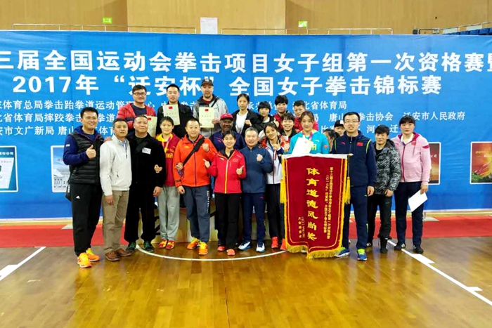 本网讯3月17日至23日,第十三届全运会拳击项目女子第一次资格赛暨2017年全国女子拳击锦标赛在河北迁安举行,我院拳跆中心13名运动员在中心主任张文军,教练员任强、陈涛的带领下取得了1金、3银、2铜和1个第五名的优异成绩并获得体育道德风尚奖,顺利挺进全运会决赛圈。