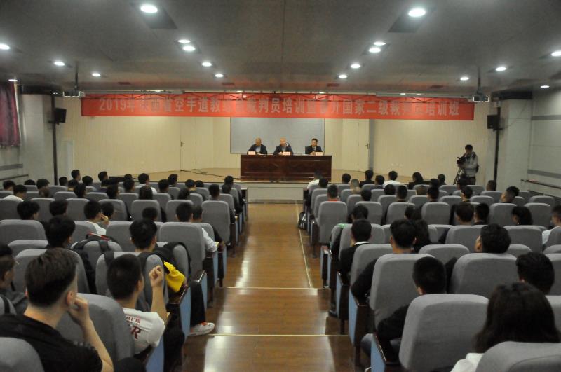 5月11日上午,2019年陕西省空手道教练员裁判员培训暨晋升国家二级裁判员培训班开班仪式在我院举行。中国空手道协会讲师、国家A级裁判员庆玉林,省体育局竞体处副处长许志勇、省拳跆中心副主任李涛以及来自全省110名教练员裁判员参加了开班仪式。