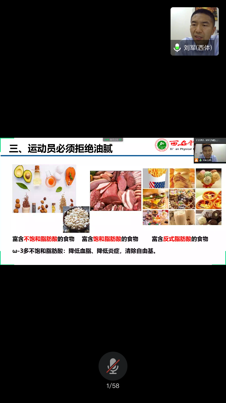 2020年6月18日晚,我院附属竞技体校与陕西省拳击跆拳道运动管理中心通过腾讯会议进行了运动员科学膳食宣传专题教育讲座。我院附属竞技体校与陕西省拳击跆拳道运动管理中心全体运动员、教练员、行政人员、食堂保障人员参加了培训讲座。