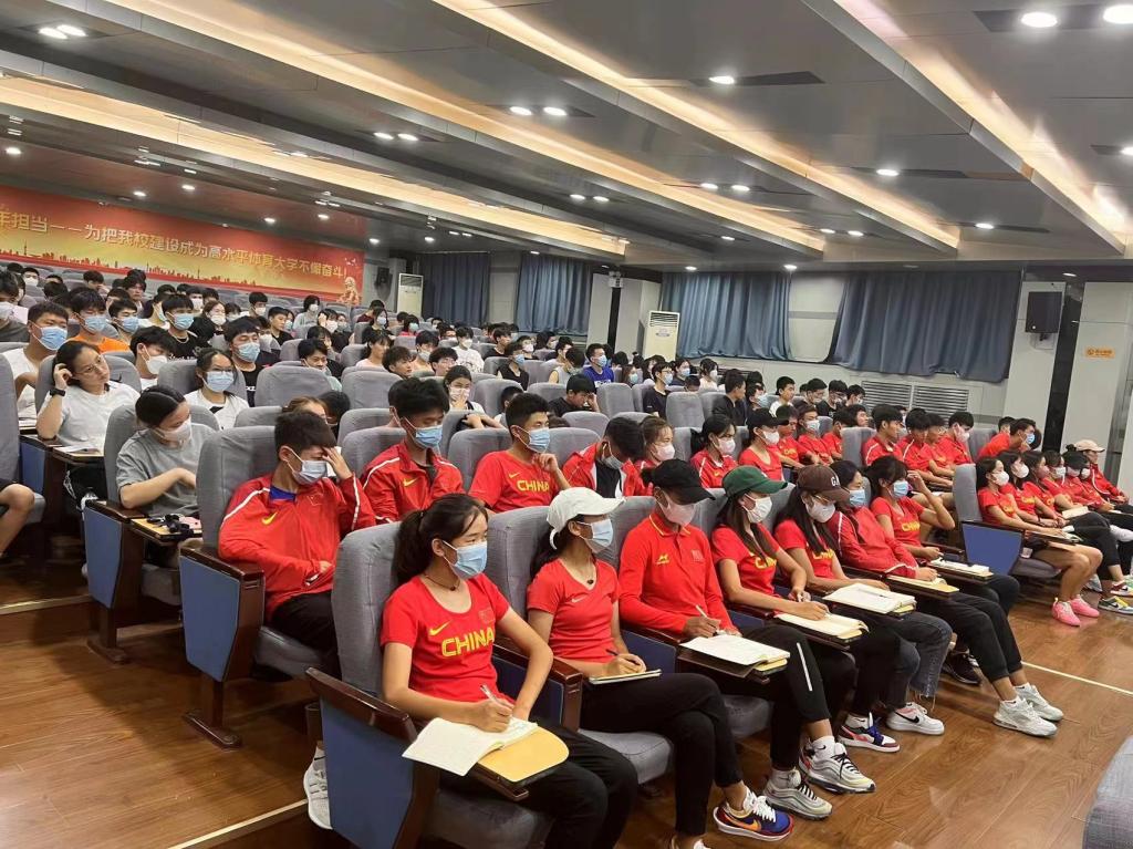 讲座开始,副校长纪伟对前期的宿舍卫生检查以及平时出现的涉及兴奋剂方面的问题再次作出要求。长期以往一直以“零容忍、零出现”的态度对待兴奋剂坚决杜绝此类事件发生。随后,队医常宁从兴奋剂的起源和危害谈起,列举了常见的兴奋剂物质、禁用清单、禁用方法,重点阐述了为什么要坚决反兴奋剂以及如何用知识武装头脑、严防食品药品误食误用、坚决不食用外卖等来源不明食品。