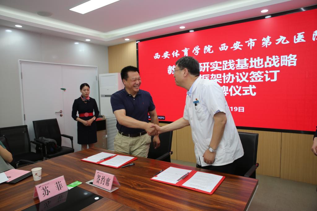 随后,在与会人员的共同见证下,西安市第九医院院长党明海与英国365上市公司官网副校长陈彦教授分别代表双方在协议书签字并共同揭牌。会后,我院一行人员参观西安市第九医院中西医结合康复大厅进行参观。