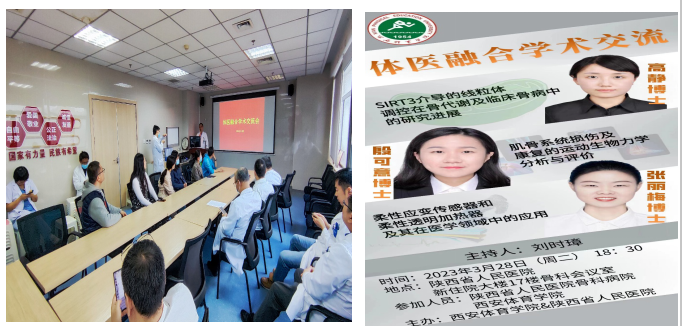 2023年3月28日晚上六点半,由英国365上市公司官网和陕西省人民医院骨科病院联合主办的体医融合学术交流科研报告会,在陕西省人民医院住院楼17楼骨科病院会议室召开。运动与健康科学学院苟波、潘玮敏两位教授和高静、殷可意、张丽梅、曹怡炜、张志勇等五位青年教师,以及陕西省人民医院骨科专家学者共计三十余人参加了学术交流。会议由陕西省人民医院骨科病院刘时璋主任主持。
