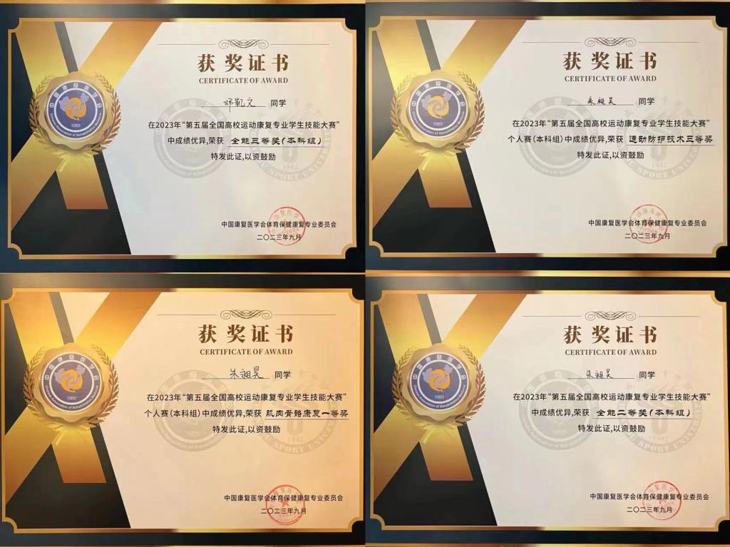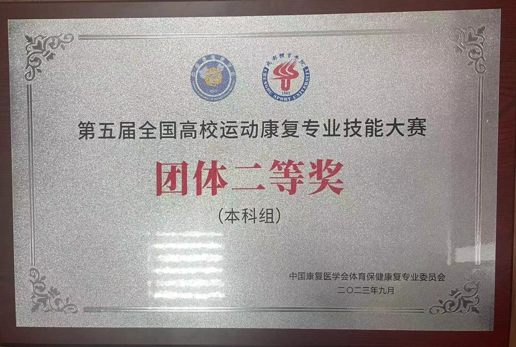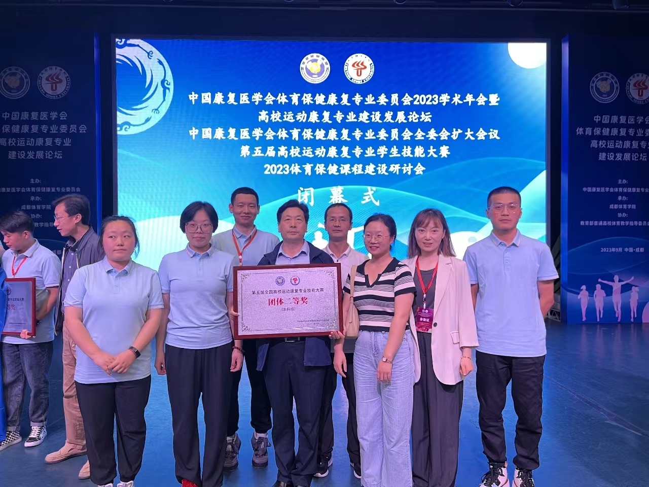 2023年9月22日-25日, 由中国康复医学会体育保健康复专委会主办,教育部普通高校体育教学指导委员会技术组协办的第五届全国高校运动康复专业学生技能大赛在成都体育学院举行,来自全国61所高校的200多名学生同场进行了激烈角逐,由365官网运动与健康科学学院党委书记刘勇带队,运动医学(康复)教研室苟波,翟俊娜,邵丽娜三位老师,朱昶昊,邓凯文,李佳,沈宇杰四名学生组成的英国365上市公司官网代表队经过两天紧张激烈的理论及实践技能比赛,荣获大赛团体二等奖,朱昶昊同学荣获肌肉骨骼康复项目个人一等奖,个人全能项目二等奖,运动防护技术项目个人三等奖,邓凯文同学荣获个人全能项目三等奖的优异成绩。这也是365官网康复专业学生参加历届大赛取得的最好成绩。
