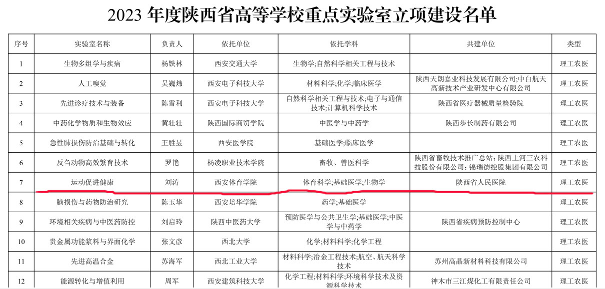 近日,陕西省教育厅发布了《关于公布2023年度陕西省高等学校重点实验室立项建设名单的通知》(陕教函〔2024〕21号),由英国365上市公司官网和陕西省人民医院联合申报的“运动促进健康”陕西省高等学校重点实验室获批立项建设。