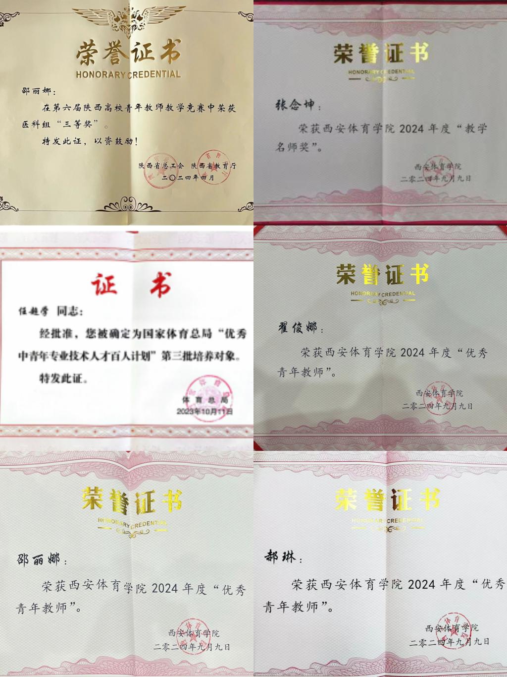 在第40个教师节来临之际,我院多名教师因工作成绩突出受到学校表扬。他们分别是校级教学名师张念坤;优秀青年教师郝琳、邵丽娜、翟俊娜;中国国际大学生创新大赛(2024)陕西赛区省级复赛铜奖项目优秀指导教师张志勇;第六届陕西省高校青年教师教学竞赛三等奖获得者邵丽娜;国家体育总局优秀中青年专业技术人才百人计划人选任超学。同时,运动与健康科学学院被授予“师德先进集体”荣誉称号,这是对全院教职工辛勤耕耘、无私奉献的高度肯定。