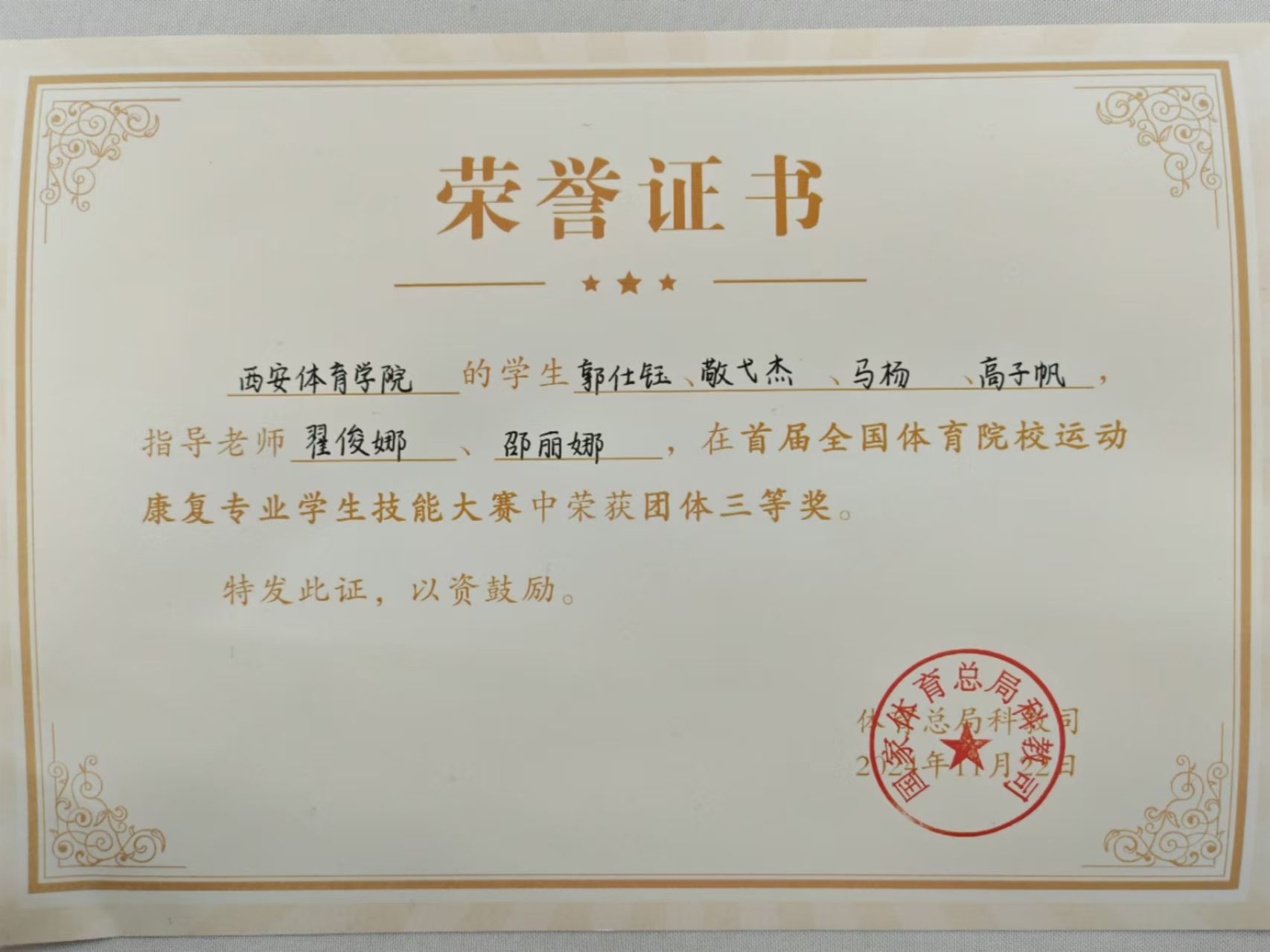2024年11月22日,由我院副院长刘远新、运动医院教研室主任翟俊娜、教师邵丽娜老师带领2021级运动康复专业学生参加了由国家体育总局科教司主办、北京体育大学承办的2024全国体育院校运动康复学生技能大赛,荣获三等奖。