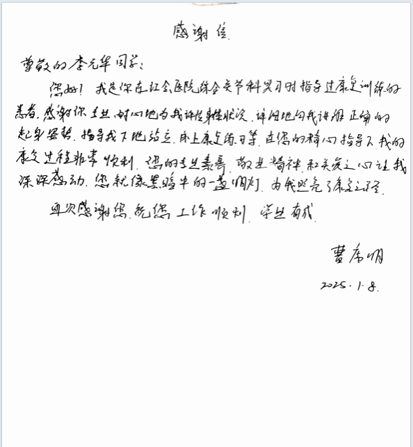 表扬信中提到,李元华同学以专业素养和敬业精神,帮助患者全面评估身体状况,熟练应用所学的康复治疗技术,耐心细致讲解示范正确的起身姿势,并指导患者进行下地站立、床上康复练习等一系列康复动作,确保治疗效果最大化。在他的专业指导下,患者康复过程进展顺利,身体状况得到了显著改善。