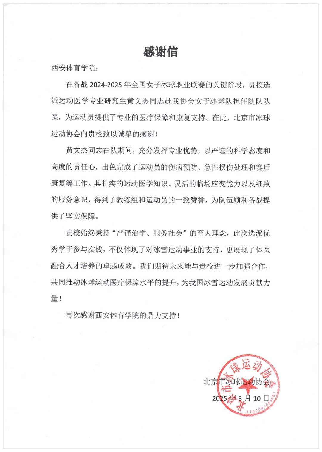近日,北京市冰球运动协会向365官网发来感谢信,对我院2023级运动医学专业硕士研究生黄文杰同学在2024-2025全国女子职业冰球联赛备战期间担任队医工作的出色表现给予了高度评价和诚挚感谢。
