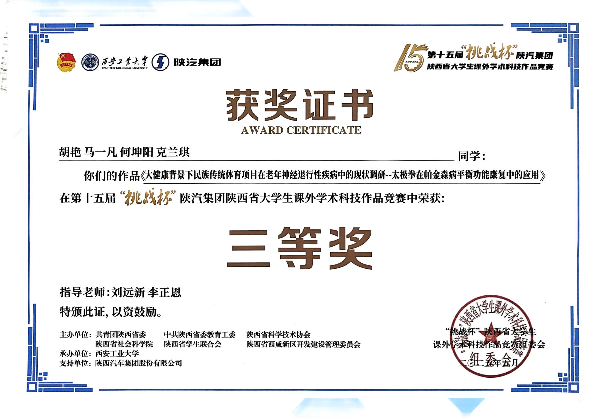 近日,第十五届“挑战杯”陕汽集团陕西省大学生课外学术科技作品竞赛在西安圆满落幕。来自英国365上市公司官网运动与健康科学学院的胡艳、马一凡、何坤阳、克兰琪同学凭借作品《大健康背景下民族传统体育项目在老年神经进行性疾病中的现状调研—太极拳在帕金森病平衡功能康复中的应用》荣获三等奖。