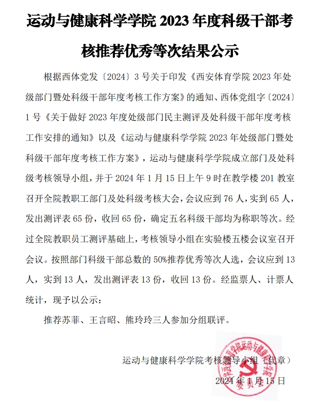 运动与健康科学学院2023年科级干部考核推荐优秀等次结果公示