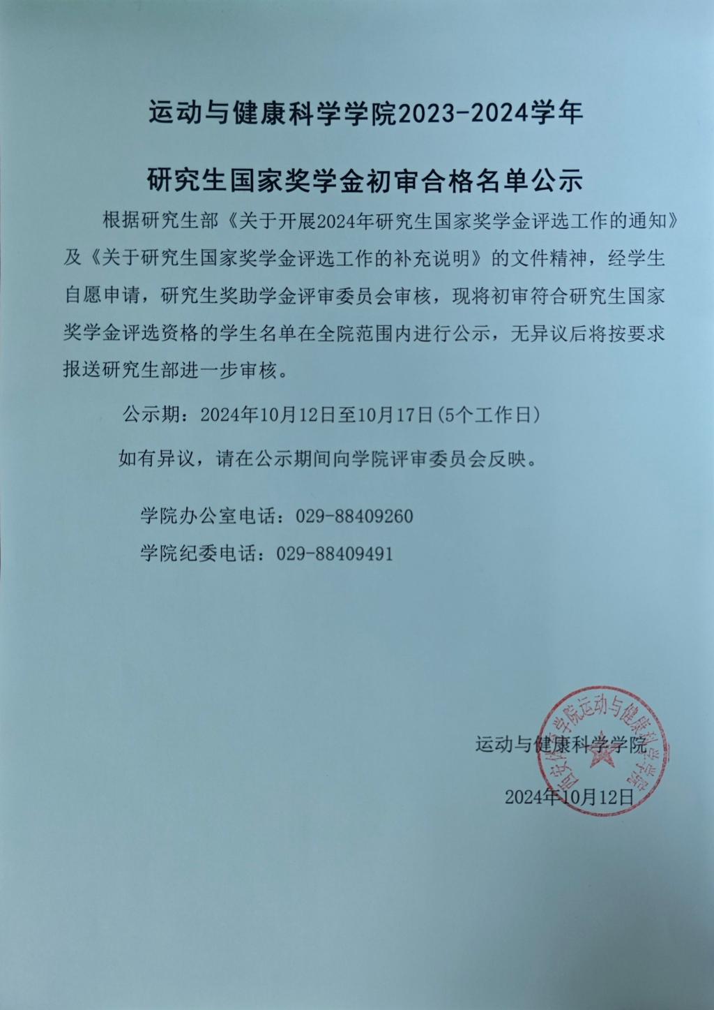运动与健康科学学院2023-2024学年研究生国家奖学金初审合格名单公示