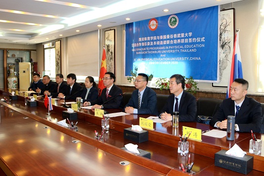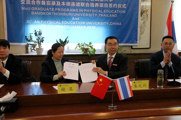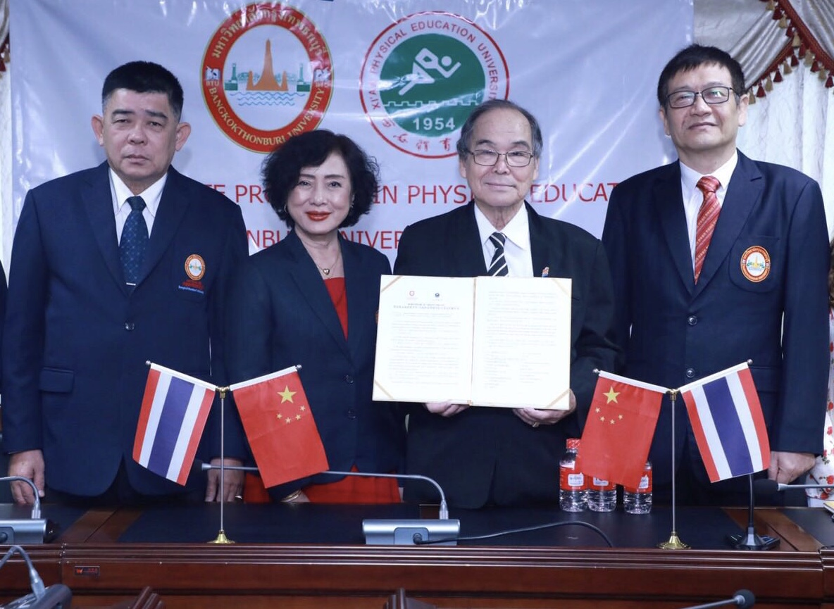 校长朱元利和泰国曼谷吞武里大学校长Bangon Benjathikul博士在签约仪式上分别致辞。朱元利在致辞中指出,曼谷吞武里大学是一所泰国教育部管理的著名综合性大学,是泰国办学层次以及专业设置较为齐全的大学之一,学历受中国教育部及世界认可。尤其是体育学科专业实力雄厚,具有广泛影响力,近年来积极参与“一带一路”建设,与我国多所专业体育院校建立交流合作关系,广泛开展体育人才培养、体育科研交流、体育文化传播等合作。此次两校在相互尊重、互信互助、携手发展的基础上,成功签署交流合作备忘录及“本硕连读联合培养”项目,是两校基于友好交往、着眼未来发展,充分落实优质资源共享,共同推进办学发展共识所形成的重要成果,也是我们两校为中泰两国在文明互鉴、文化互融道路上持续发展所做出的努力和贡献。