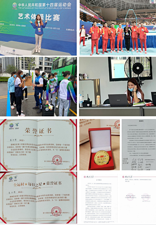 运动训练学院张佩莉、郑峰、于昕、黄环、张龙、王伟、南海涛、刘志云等20余名师生分别在手球、曲棍球、棒球、垒球、橄榄球、蹦床、游泳、田径、空手道等项目竞委会担任不同的岗位,他们坚守岗位,履职尽责,圆满的完成了比赛任务,受到了各项目竞委会的一致好评。学院辅导员南海涛是棒球竞委会驻村联络员,积极与村委会、棒球竞委会沟通协调,保障参赛队伍各项需求,为运动员取得好成绩贡献自己的力量,被全运村授予“敬业之星”荣誉称号;2019级学生朱子彤,在第十四届全国运动会蹦床、艺术体操项目竞委会竞赛组织处工作,担任蹦床、艺术体操竞委会驻全运村联络员一职,该同志奉献精神强,封闭食宿在全运村,不讲困难、不提条件、加班加点、默默奉献,利用个人专业优势出色的完成了技术官员在全运村的服务保障工作和竞委会交办的其他竞赛组织工作,体现出极佳的专业素养,获得了竞委会和全运村的高度认可,被全运村授予“党员保赛模范岗和每日之星”荣誉称号;学院党政办公室副主任刘志云,在十四运会担任空手道项目联络官,他尽职尽责,勇于担当,积极与组委会、中国空手道协会、省拳跆中心及项目竞委会沟通协调,同空手道项目竞委会工作人员密切配合,为十四运空手道项目圆满举办做出了积极的贡献,受到了空手道项目竞委会的感谢。