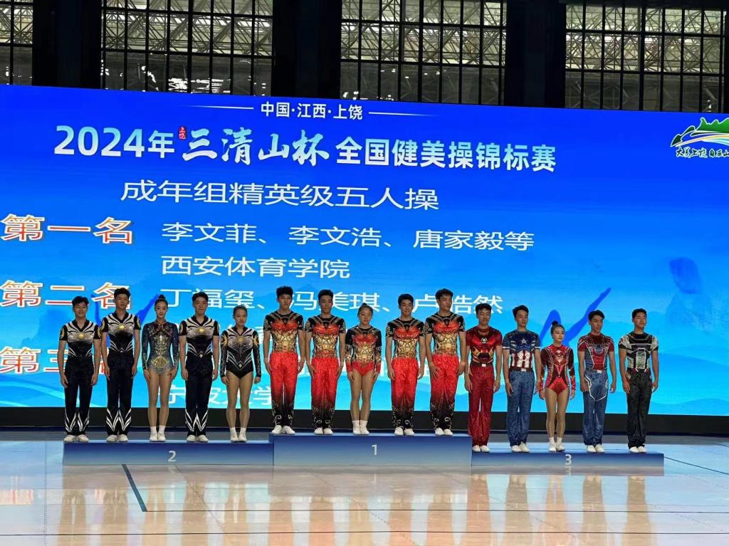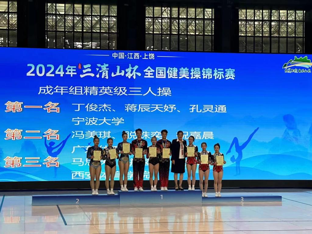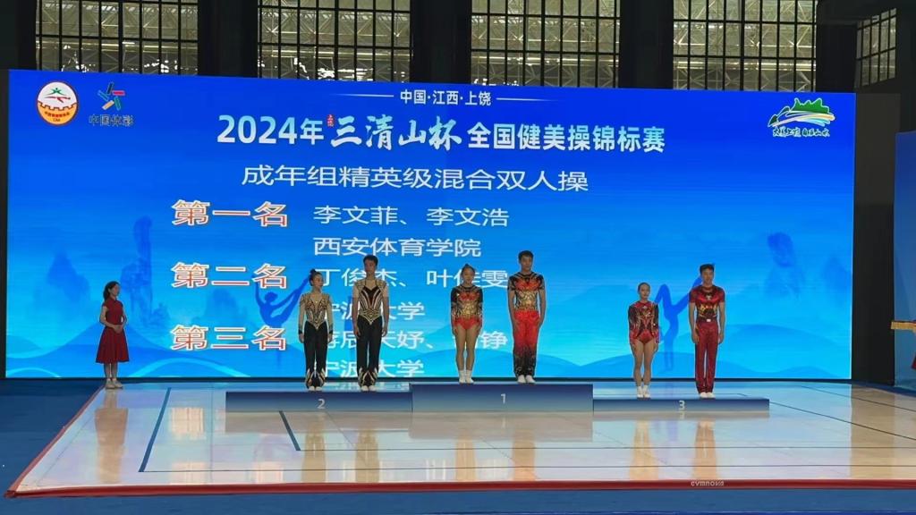365官网健美操队由樊超老师和牛嘉老师带领11名队员参加了成年组精英级男单、女单、混双、三人操和五人操的比赛。