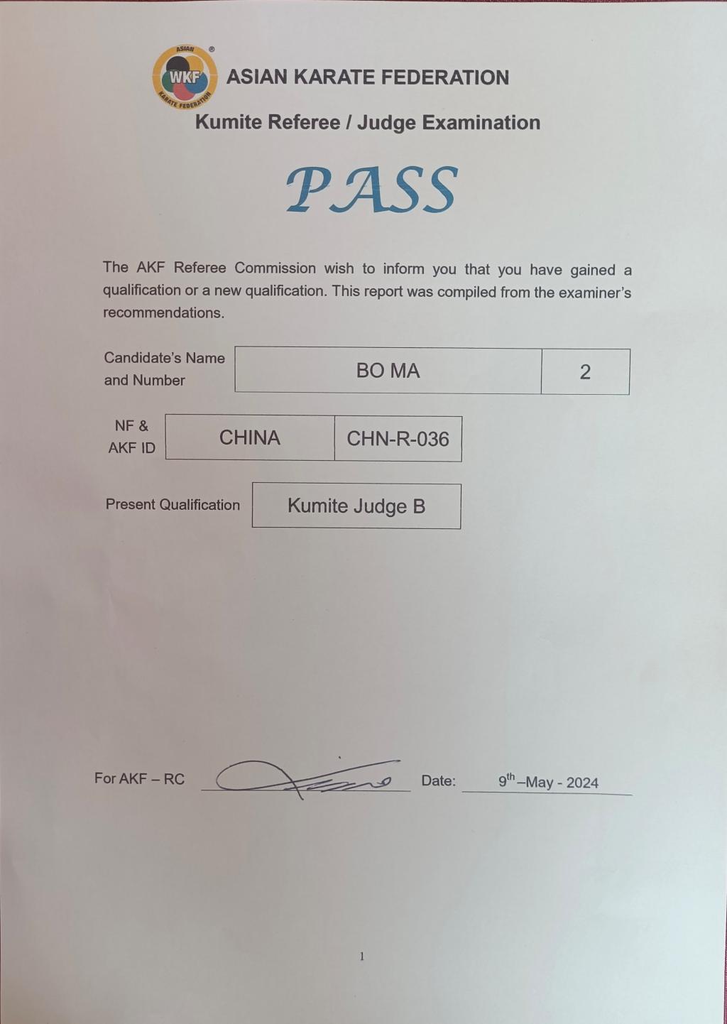2024年5月8日,在即将举办的第11届东亚空手道锦标赛之前,由亚洲空手道联合会组织的亚洲级空手道裁判员考试,通过理论和实操考试,我院重竞技教研室马波教授以优异的成绩和出色的表现顺利通过,晋升为亚洲级裁判员。