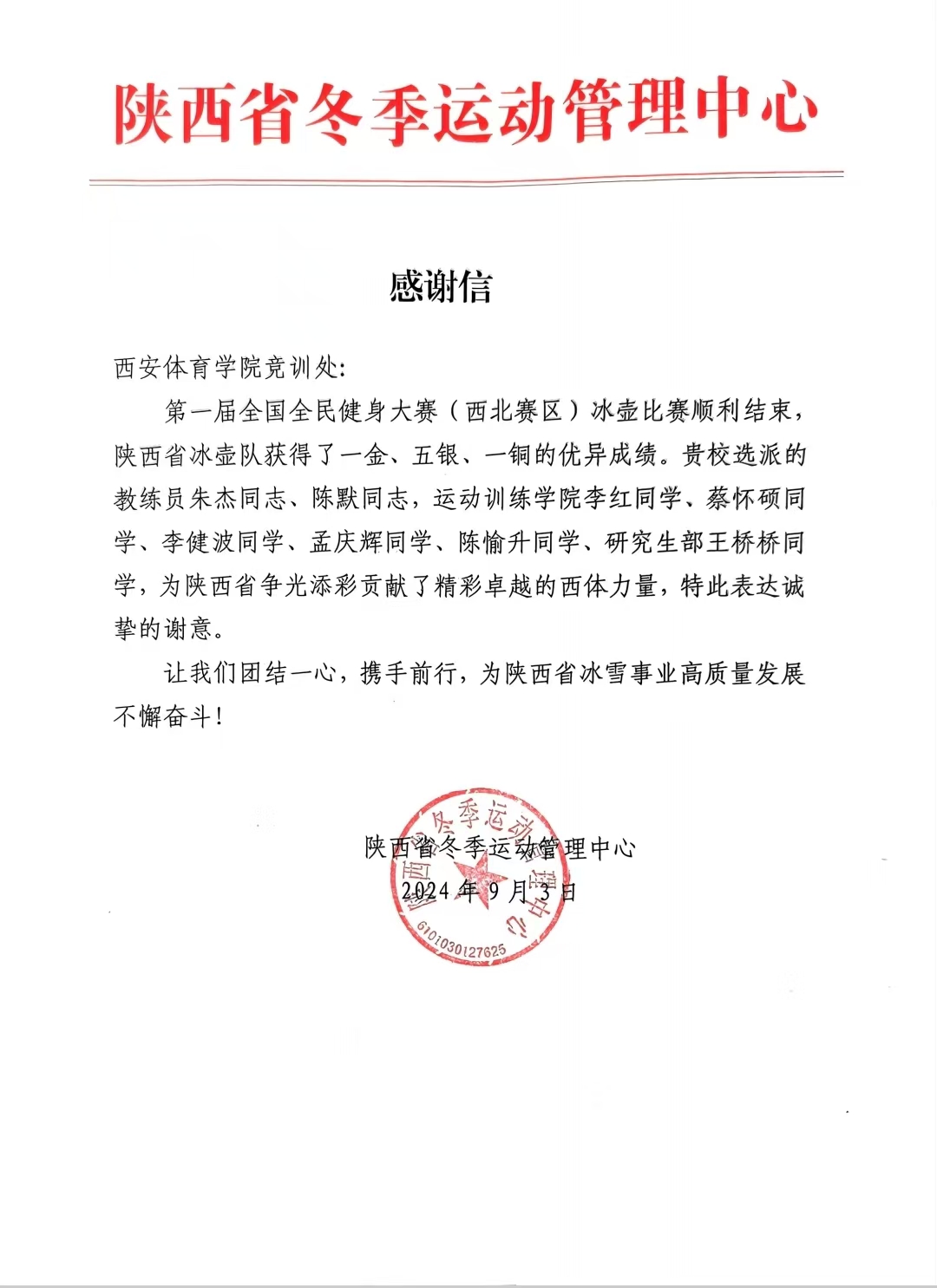 在第一届全国全民健身大赛(西北赛区)冰壶比赛中,陕西省冰壶队荣获一金、五银、一铜佳绩。陕西省冬季运动管理中心特向英国365上市公司官网竞训处及其教练员朱杰、陈默,以及运动员李红、蔡怀硕、李健波、孟庆辉、陈愉升、王桥桥等表示感谢。他们的卓越表现,为陕西省冰雪事业增光添彩。期待双方继续携手,推动冰雪运动发展。