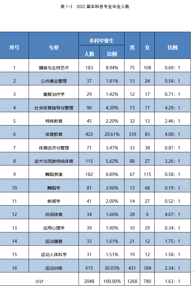 涉及16个本科专业(方向),12个硕士专业(方向)。本科毕业生人数超100人的有5个专业(体育教育专业、运动训练专业、武术与民族传统体育专业、舞蹈表演专业、播音与主持专业)。本科专业涵盖新闻学、经济学、心理学、艺术学、管理学等学科门类,研究生专业涵盖体育教育训练学、体育管理学、应用心理学等学科门类。
