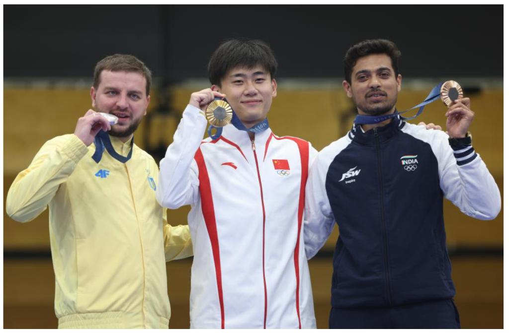 8月1日,冠军中国选手刘宇坤(中)、亚军乌克兰选手库里什(左)和季军印度选手库萨莱在颁奖仪式上。新华社记者赵丁喆摄