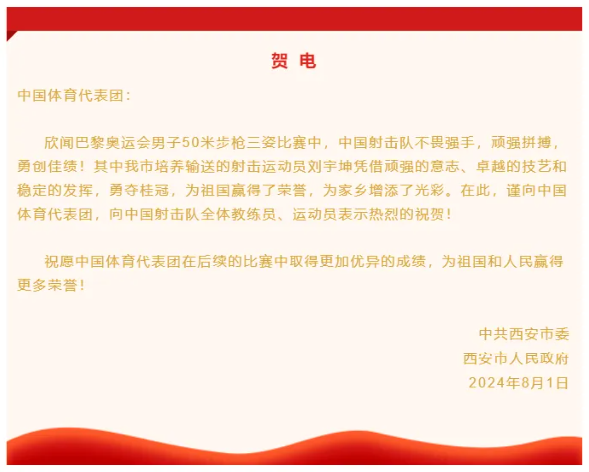 赛后,西安市委市政府向中国体育代表团致贺电。贺电说:“欣闻巴黎奥运会男子50米步枪三姿比赛中,中国射击队不畏强手,顽强拼搏,勇创佳绩!其中我市培养输送的射击运动员刘宇坤凭借顽强的意志、卓越的技艺和稳定的发挥,勇夺桂冠,为祖国赢得了荣誉,为家乡增添了光彩。在此,谨向中国体育代表团,向中国射击队全体教练员、运动员表示热烈的祝贺!祝愿中国体育代表团在后续的比赛中取得更加优异的成绩,为祖国和人民赢得更多荣誉!