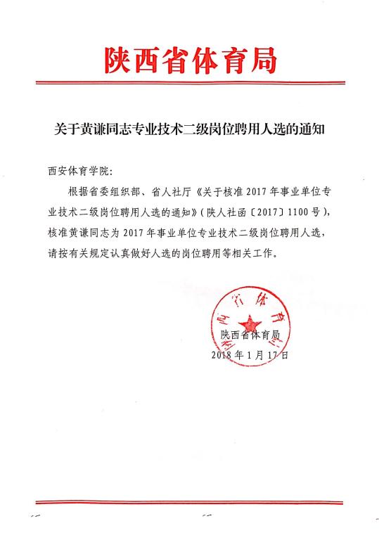 关于黄谦同志专业技术二级岗位聘用人选的通知