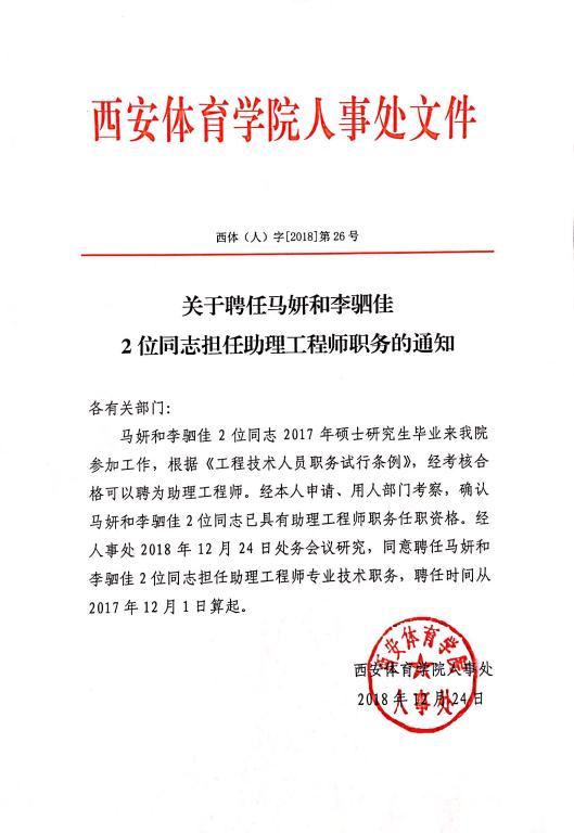关于聘任马妍和李驷佳2位同志担任助理工程师职务的通知