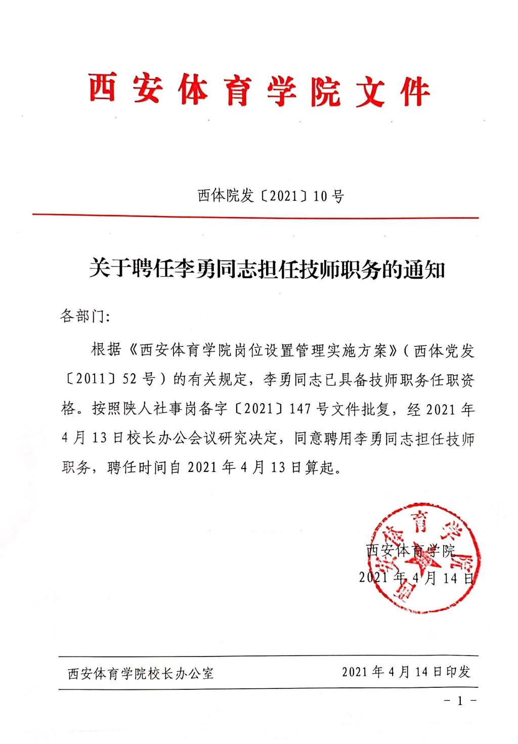 关于聘任李勇同志担任技师职务的通知