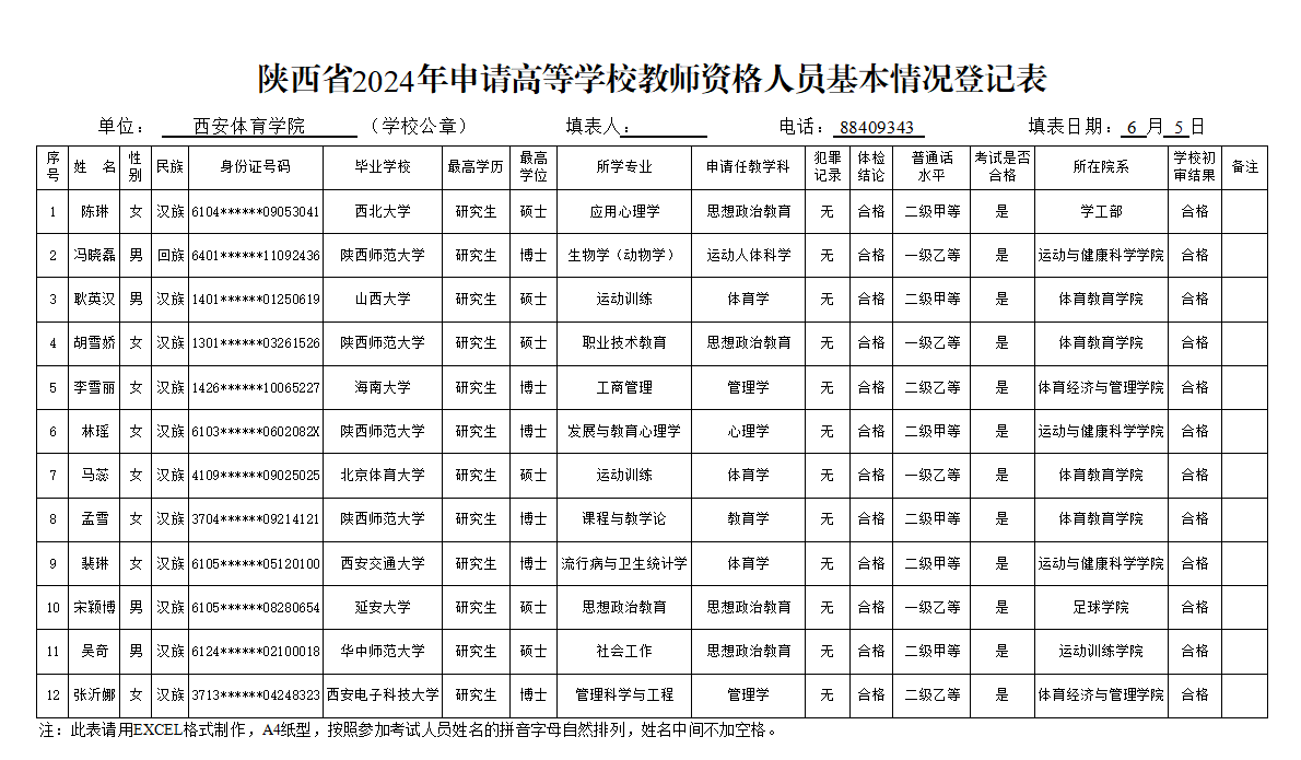 根据《陕西省教育厅办公室 关于做好2024年全省高等学校教师资格专业技能考试与认定工作的通知》(陕教师办〔2024〕7 号)要求,现将365官网参加2023年教师资格教育基础理论知识考试合格,符合陕西省2024年申请高等学校教师资格人员基本情况予以公示,公示期5个工作日(2024年6月6日-2024年6月13日,如有异议,请于2024年6月13日前向人事处或校纪检监察部门客观如实地反映公示对象的情况。