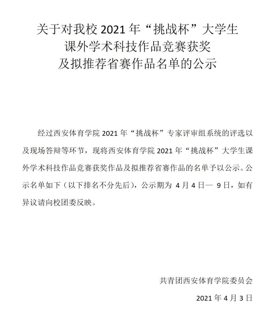 关于对365官网2021年“挑战杯”大学生 课外学术科技作品竞赛获奖及拟推荐省赛作品名单的公示