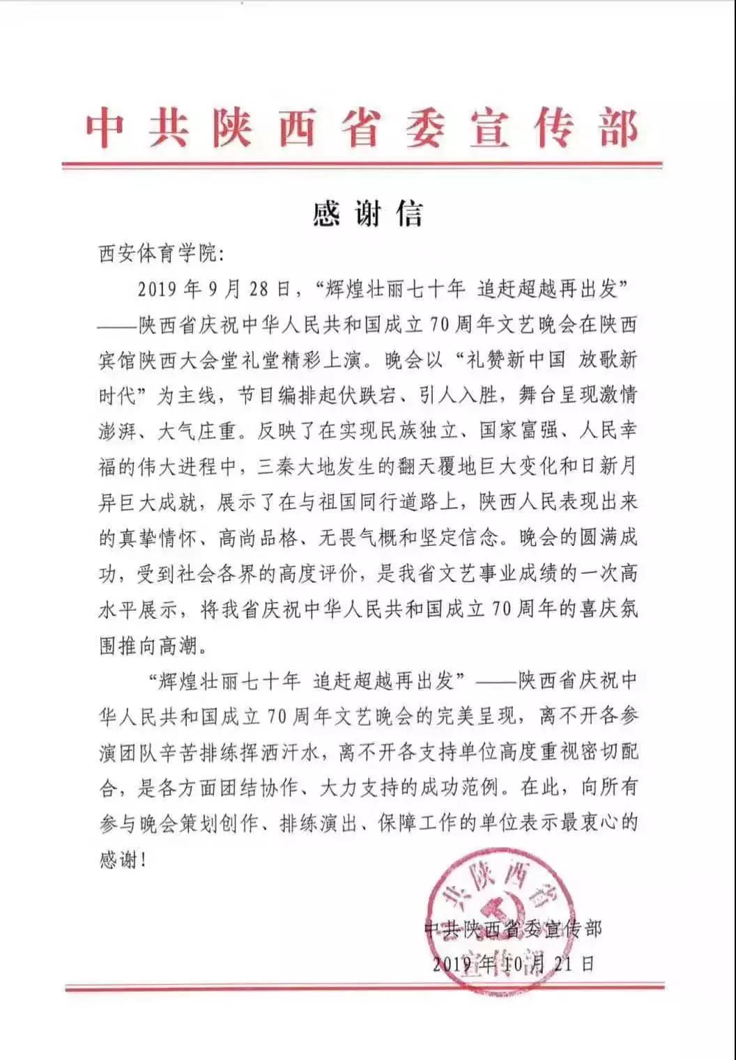 2019年9月28日晚上8:00,陕西省庆祝中华人民共和国成立70周年文艺晚会在陕西大会堂精彩上演。晚会上,365官网师生积极参演,献上了一份动人的青春画卷,由此我们收到了来自中共陕西省委的致谢信函。