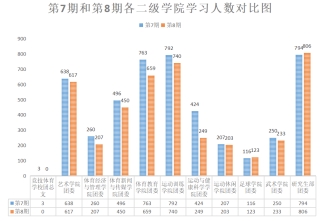 在本期与上一期的“青年大学习”学习人数对比图中,研究生部团委(↑8人),足球学院团委(↑7人)学习人数较上一期相比有所增长,竞技体育学校团委总支(↓3人),艺术学院团委(↓21人),体育经济与管理学院(↓53人),体育新闻与传媒学院团委(↓46人),体育教育学院团委(↓104人),运动训练学院团委(↓52人),运动休闲学院团委(↓4人),运动与健康科学学院团委(↓175人),武术学院团委(↓27人)学习人数较上一期相比有所下降。