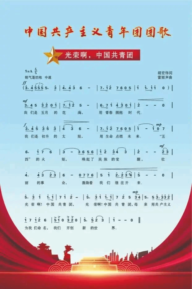 中国共产主义青年团团歌是《光荣啊,中国共青团》,由胡宏伟作词,雷雨声作曲。