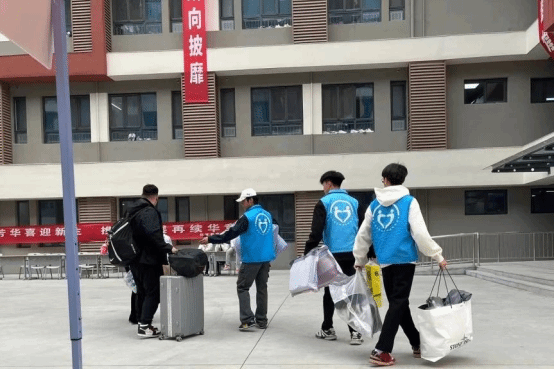 在校园各个角落,身着蓝色马甲的志愿者们成为了一道道亮丽的风景线。如同一团团燃烧的火焰,用他们的热情和爱心,温暖着每一位初来乍到的新生。志愿者们分工明确,有的在路口引导新生前往报到地点,有的帮忙搬运行李,有的耐心解答新生和家长们的各种问题。他们忙碌的身影在人群中穿梭,额头上的汗水闪烁着奉献的光芒。