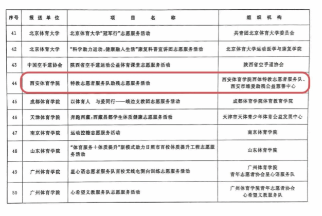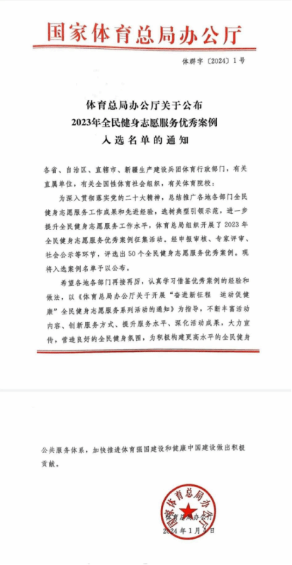2023年9月,国家体育总局印发《关于开展2023年全民健身志愿服务优秀案例征集活动的通知》,各地各单位积极响应,报送了一批扎根基层、服务群众的全民健身志愿服务案例。经申报审核、专家评审、社会公示等环节,最终遴选出50个工作成效好、示范作用强的优秀案例。其中365官网报送的“特教志愿者服务队助残志愿服务活动”获得全民健身志愿服务优秀案例。
