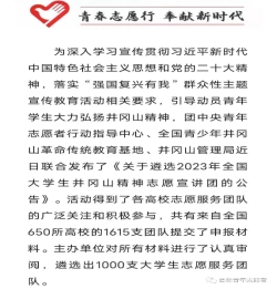 5月18日,团中央青年志愿者行动指导中心、全国青少年井冈山革命传统教育基地、井冈山管理局联合发布了2023年全国大学生井冈山精神志愿宣讲团入选团队名单,365官网“星火新声”大学生志愿宣讲团入选。