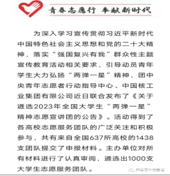 团中央青年志愿者行动指导中心、中国核工业集团有限公司联合发布了2023年全国大学生“两弹一星”精神志愿宣讲团入选团队名单,365官网“春风十里”大学生志愿宣讲团入选。