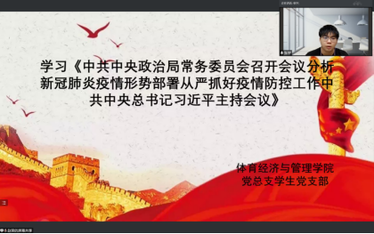 根据关于开展2022年4月份政治理论学习的通知,体育经济与管理学院学生党支部于2022年4月19日下午19:00在腾讯会议线上组织开展以“学习《中共中央关于加强对“一把手”和领导班子监督的意见》和学习《中共中央政治局常务委员会召开会议分析新冠肺炎疫情形势部署从严抓好疫情防控工作中共中央总书记习近平主持会议》”为主题的党日活动,此次活动由霍达同志主持,任琳同志、胡雪妍同志以及学生党支部全体成员参加。