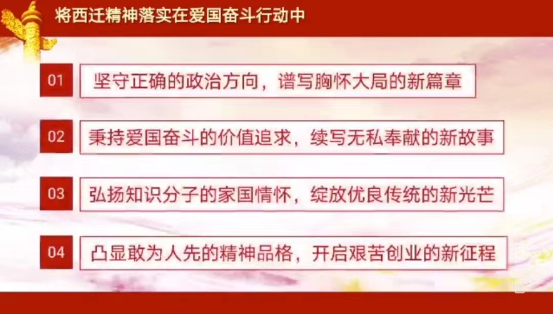 总结: 西迁精神即是中国共产党人的精神谱系构成之一,也是我们中华民族精神脊梁中的一节,更是我们知识分子牢记初心使命的生动体现,我们作为新时代社会主义青年更应牢记初心使命,讲西迁精神落实在爱国主义奋斗行动中。秉持爱国奋斗的价值追求,续写无私奉献的新故事。