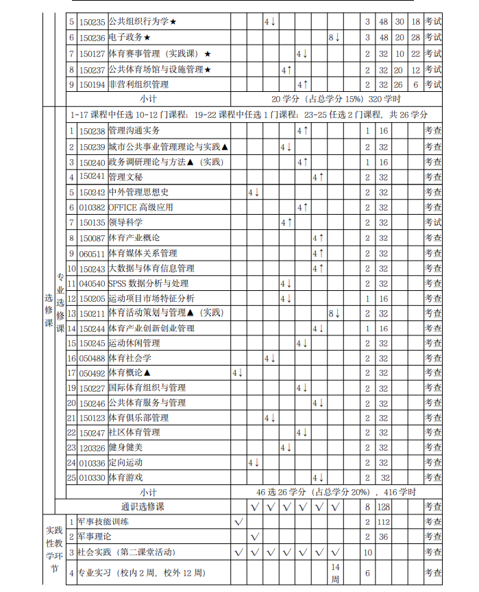 核心课程:管理学原理、体育管理学、公共管理学、公共经济学、公共政策 学、公共事业管理概论、公共组织财务管理、公共人力资源管理、公共组织行为 学、电子政务、体育赛事管理、公共体育场馆与设施管理、城市公共事业管理理 论与实践等。