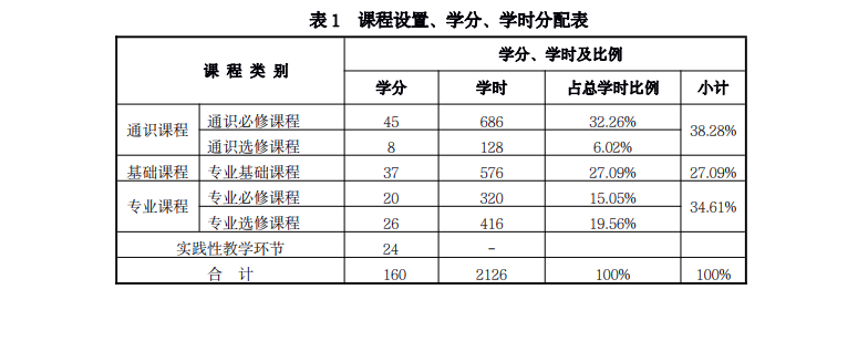 八、课程结构及学时、学分分配 本专业课程结构由必修课程(通识必修课程、专业基础课程、专业课程)和 选修课程及实践性教学环节构成。其课程结构、教学周数与学分分配分别见表 1、 表2