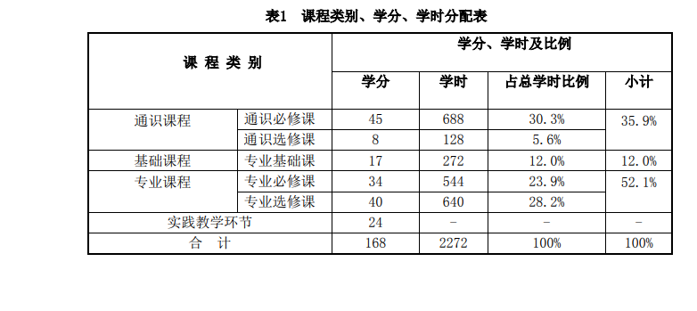 八、课程结构及学时、学分分配 本专业课程结构由必修课程(通识必修课程、专业基础课程、专业课程)和选修课程及 实践性教学环节构成。其课程结构、教学周数与学分分配分别见表1、表2。