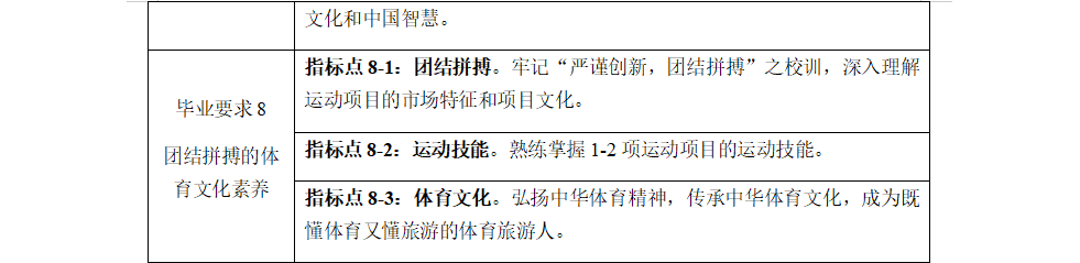 毕业要求8(团结拼搏的体育文化素养):牢记“严谨创新,团结拼搏”之校训,深入理解运动项目的市场特征和项目文化;熟练掌握1-2项运动项目技能;弘扬中华体育精神,传承中华体育文化,成为既懂体育又懂旅游的体育旅游人。