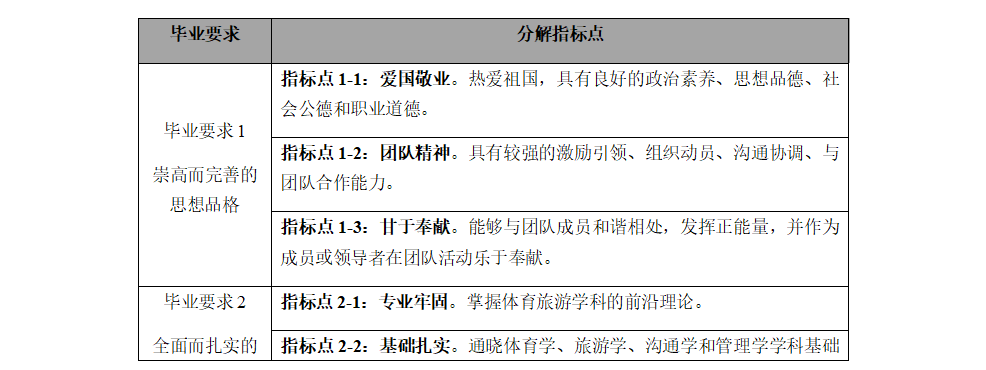 目标3(行业综合能力):具备良好的沟通能力与团队协作精神。通晓体育学、旅游学、管理学及沟通人文基础知识,深刻把握新时代体育旅游产业及体育旅游市场发展新趋势、新规律。具有较强的激励引领、组织动员、沟通协调、与团队合作能力。能够与团队成员和谐相处,协作共事,并作为成员或领导者在团队活动中发挥积极作用。