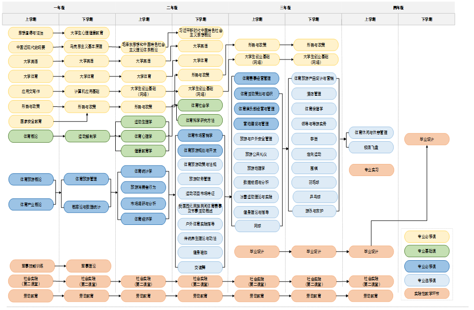 毕业要求2(全面而扎实的专业知识):掌握体育旅游学科的前沿理论;通晓体育学、旅游学、沟通学和管理学学科基础知识;具备体育旅游业所需的经营管理、营销策划、服务咨询和休闲运动项目技术指导等专业能力。