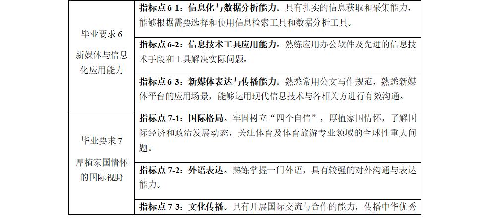 毕业要求7(厚植家国情怀的国际视野):牢固树立“四个自信”,厚植家国情怀,了解国际经济和政治发展动态,关注体育及体育旅游专业领域的全球性重大问题;熟练掌握一门外语,较强的公共沟通表达能力以及国际交流与合作的能力。