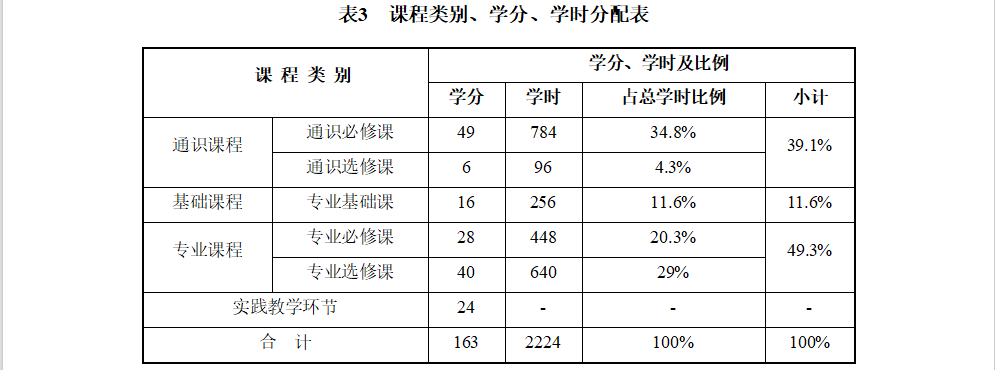 本专业课程结构由通识教育课程、专业基础课、专业素养课程、实践教学环节构成。其课程结构、教学周数与学分分配分别见表3、表4。