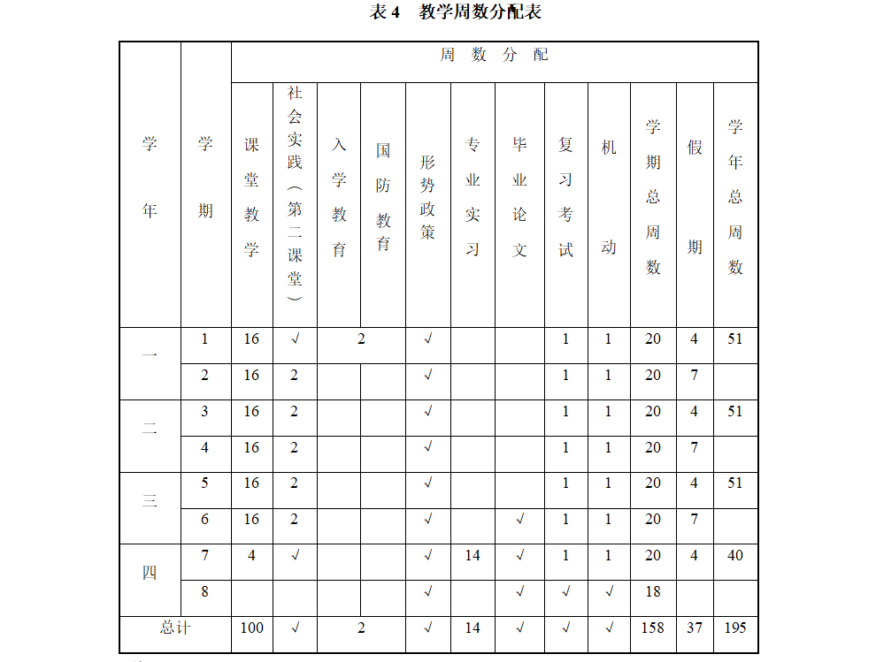 六、课程设置结构与教学周数分布(表3和表4)