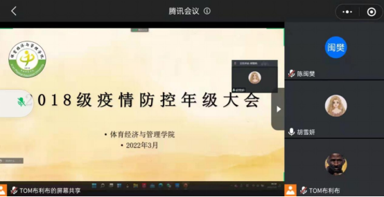 为了配合学校疫情防控管理要求,提高学生的防疫意识,切实保障同学们的健康和安全。体育经济与管理学院2018级于3月7日在腾讯会议开展线上疫情防控大会,本次会议由辅导员胡雪妍老师主持,18级全体学生参加。